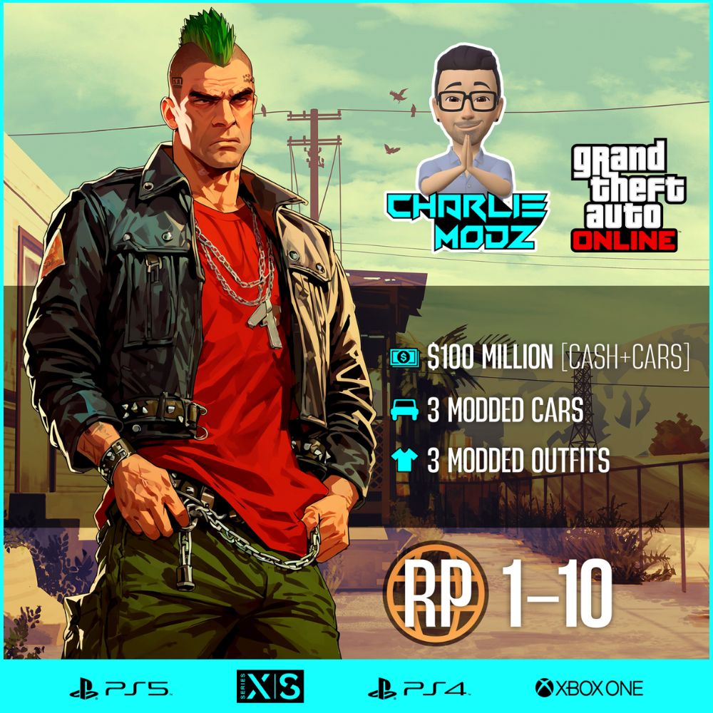 $100 Million (Cash + Cars), 3 Modded Cars, 3 Modded Outfits, RP 1–10.